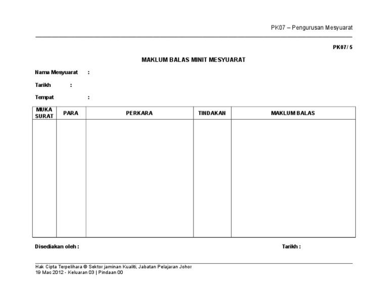 14 pembentangan minit mesyuarat lepas minit mesyuarat yang terakhir dibentangkan. Bilik gerakan, smk majakir papar m/sur par perkara tindakan maklum balas at a 5 5.1 buku pengoperasian program penyelaras. Minit mesyuarat ajk smach90 kali pertama. Translate · borang maklum balas minit mesyuarat jk. Pk15 1 maklum balas minit.
