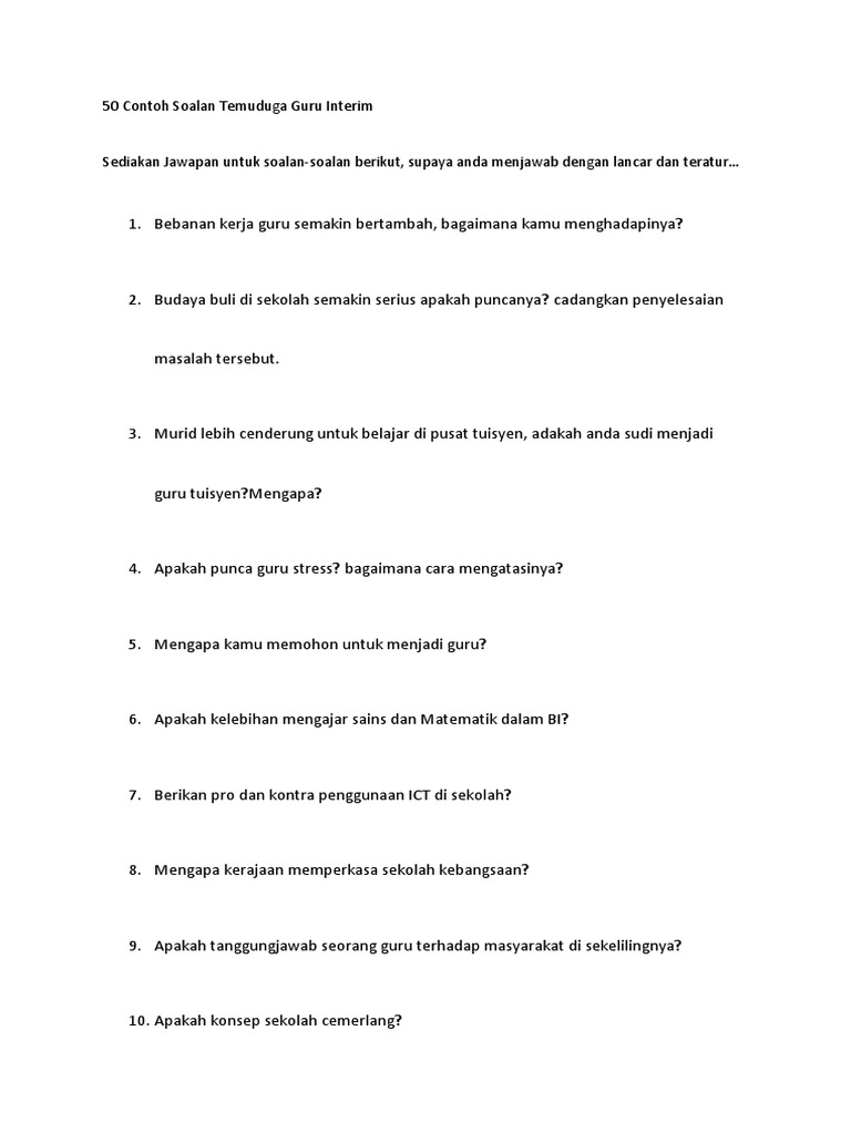 Contoh Soalan Temuduga Guru Interim Bahasa Inggeris Dokterandalan from i0.wp.com 7 soalan popular ketika temuduga. Panduan buat anda yang ingin membuat permohonan guru interim tahun 2020. Bebanan kerja guru semakin bertambah, bagaimana kamu menghadapinya? Adakah anda sudi jadi guru tuisyen jika perlu? Semakan guru interim 2020 online (keputusan). Apakah yang anda tahu tentang pertanian? Bila tarikh temu duga hampir tiba, makin gementar rasa. Dapatkan 50 contoh soalan temuduga untuk jawatan guru interim yang boleh anda jadikan panduan sebelum menghadapi temuduga sebenar.