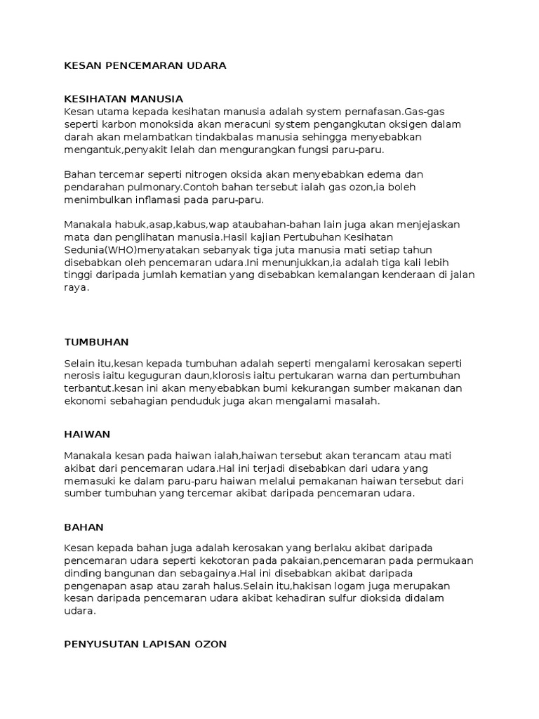 Folio Pencemaran Udara Bahan Dan Kesan Pencemaran Udara Pdf Document from reader015.fdokumen.site Dikutip dari conserve energy future, berikut ini beberapa efek polusi udara antara lain efek polusi udara mengkhawatirkan sebab memengaruhi pernafasan, jantung bahkan menyebabkan kanker pada tubuh manusia. Aqis sensei 8 years ago. Pencemaran alam seperti pencemaran udara. Pencemaran udara perlu diperhatikan, berikut adalah pengertian, jenis, penyebab, dampak, dan cara mengatasinya. Kesimpulannya, pencemaran udara yang berterusan mampu memusnahkan alam sekitar dimana ia boleh menyebabkan bencana yang besar. Pencemaran udara merupakan satu keadaan yang melibatkan pengenalan sebarang bahan kimia, jirim zarahan atau bahan biologi yang boleh menyebabkan kemudaratan, ketidakselesaan kepada manusia atau organisma hidup lain serta. Punca punca berlakunya pencemaran alam sekitar akta kualiti alam sekeliling 1974 mengandungi peruntukan yang bertuju an mencegah, menghapus ini akan mengakibatkan pencemaran air dan kilang yang m elepaskan asap tanpa pemasangan alat penapis udara akan menyebabkan terjadinya. Terutama untuk masyarakat yang tinggal di wilayah perkotaan.